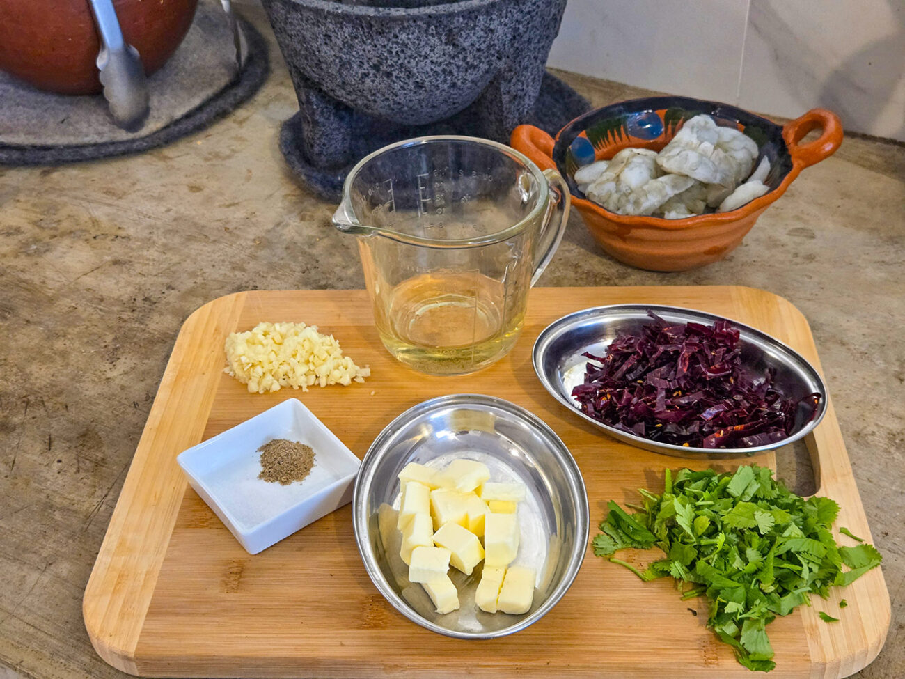 1 Färdig | Förbered alla ingredienser (Mise en place)- 🦐 Räkor: Skala och rensa bort tarmkanalerna om du använder oskalade, torka lätt med hushållspapper |