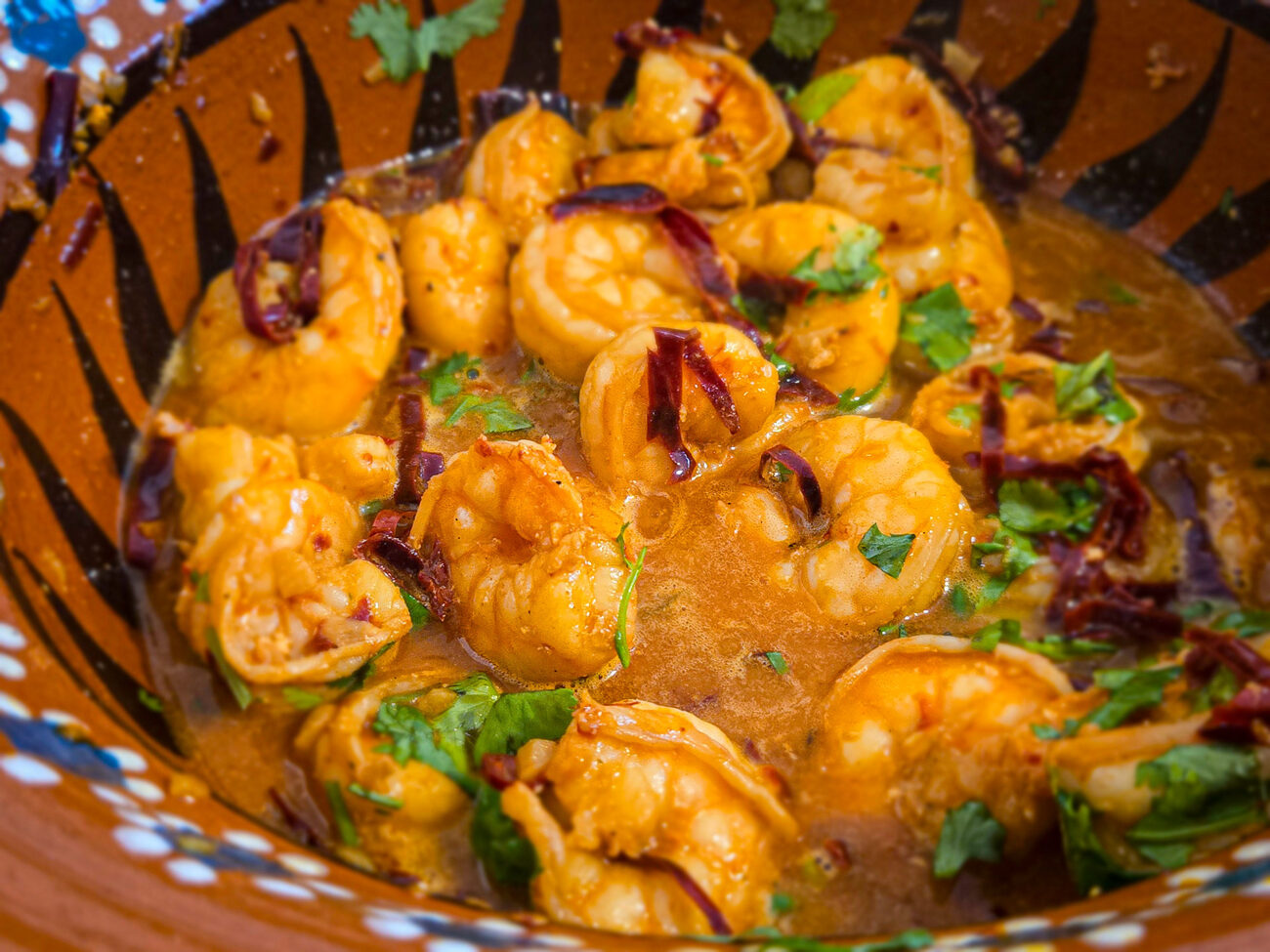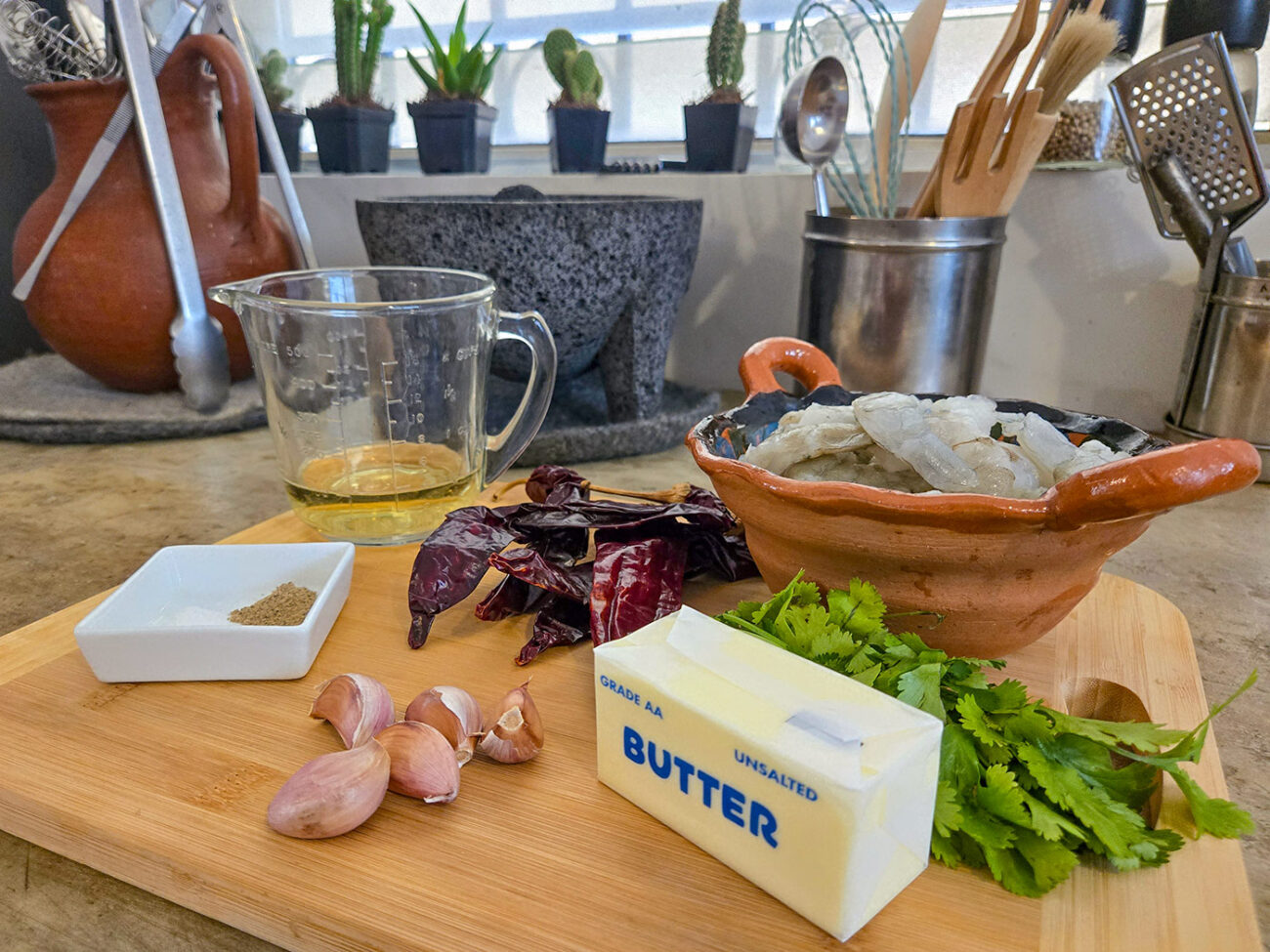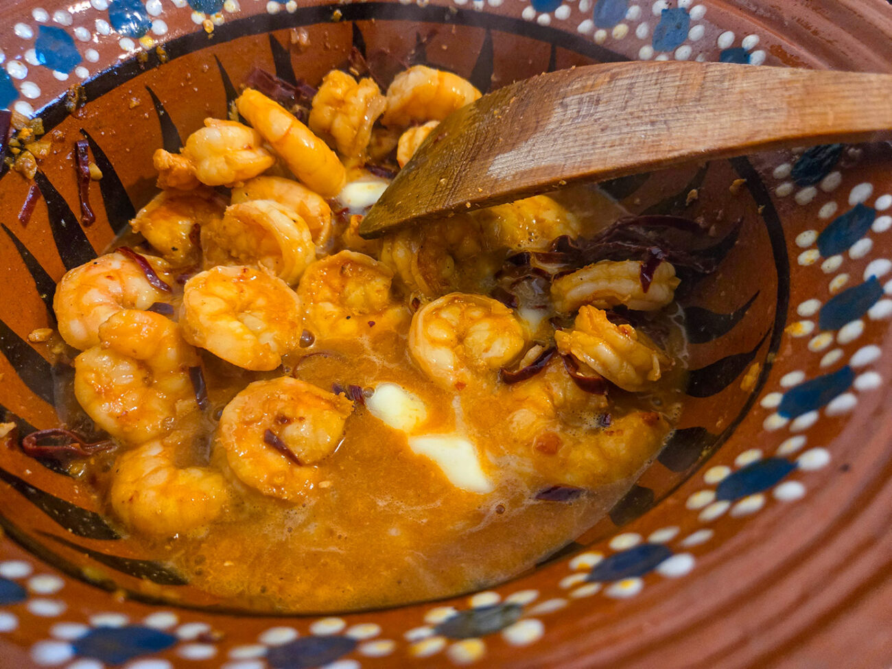 Första gången jag reste till Mexiko med min då blivande fru bjöd min nuvarande svärfar på de här räkorna — tillagade med självklar vana, kärlek och tradition i köket medan hennes bror grillade kaktus, kött och salsa utomhus på den lilla innegården somk satt inkilad mellan köket och vardagsrummet. En doft- och smakkomposition som etsade sig fast från första tuggan. Camarones, ja, att det betyder räkor är det nog många som vet, men Guajillo (uttalas ungefär gwha-hijjo) är en väldigt mild chilifrukt som används för smak snarare än hetta. Guajillo är lätt att hitta i specialistaffärer och du kan läsa mer om chilin och var du kan handla den här!