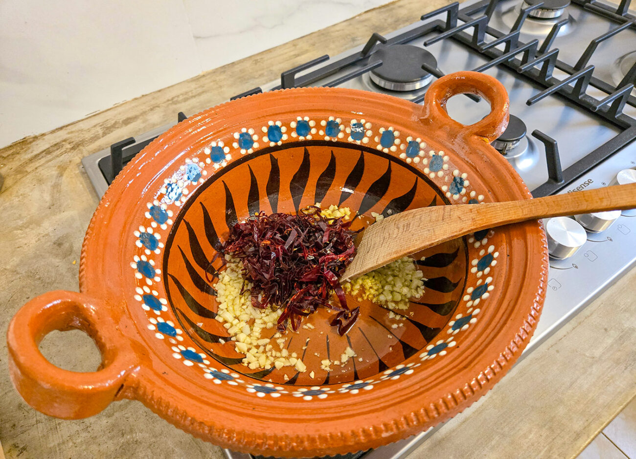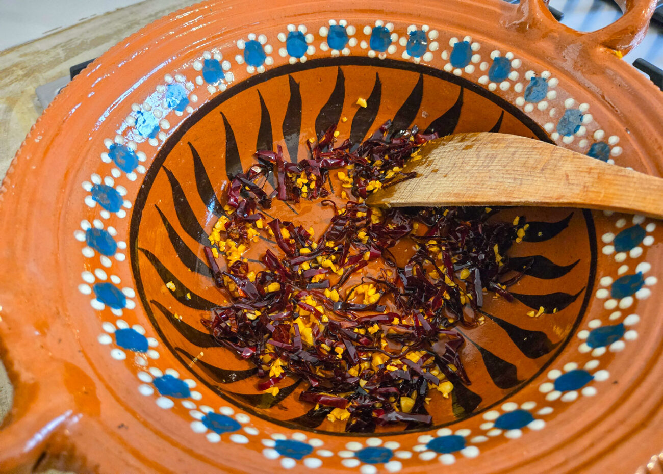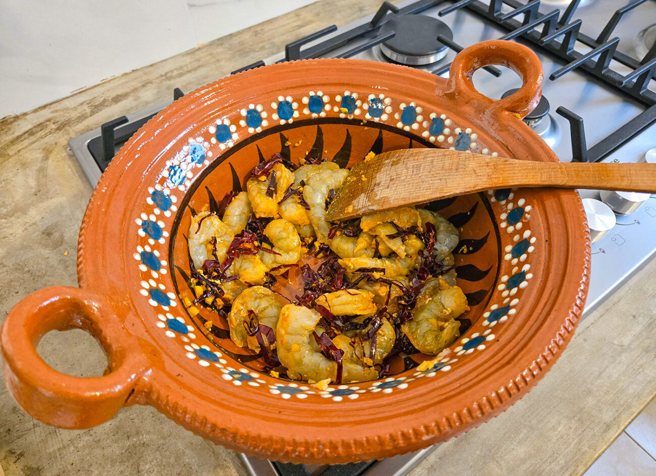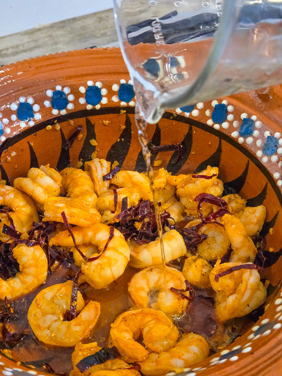 Första gången jag reste till Mexiko med min då blivande fru bjöd min nuvarande svärfar på de här räkorna — tillagade med självklar vana, kärlek och tradition i köket medan hennes bror grillade kaktus, kött och salsa utomhus på den lilla innegården somk satt inkilad mellan köket och vardagsrummet. En doft- och smakkomposition som etsade sig fast från första tuggan. Camarones, ja, att det betyder räkor är det nog många som vet, men Guajillo (uttalas ungefär gwha-hijjo) är en väldigt mild chilifrukt som används för smak snarare än hetta. Guajillo är lätt att hitta i specialistaffärer och du kan läsa mer om chilin och var du kan handla den här!