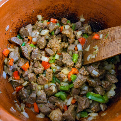 Har du inte tillgång till manteca? Då är ett paket bacon ett utmärkt alternativ: stek det krispigt, ta ur bitarna och använd baconfettet till att steka köttet och bygga grytan. Baconet kan tillsättas igen senare för sälta och textur.