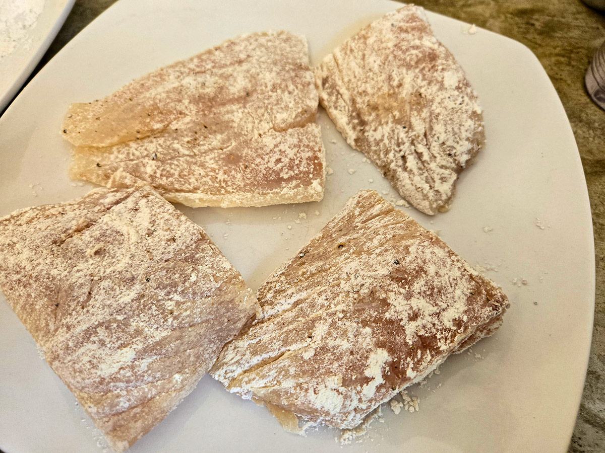 🔹 Vänd fiskbitarna i lite vetemjöl.