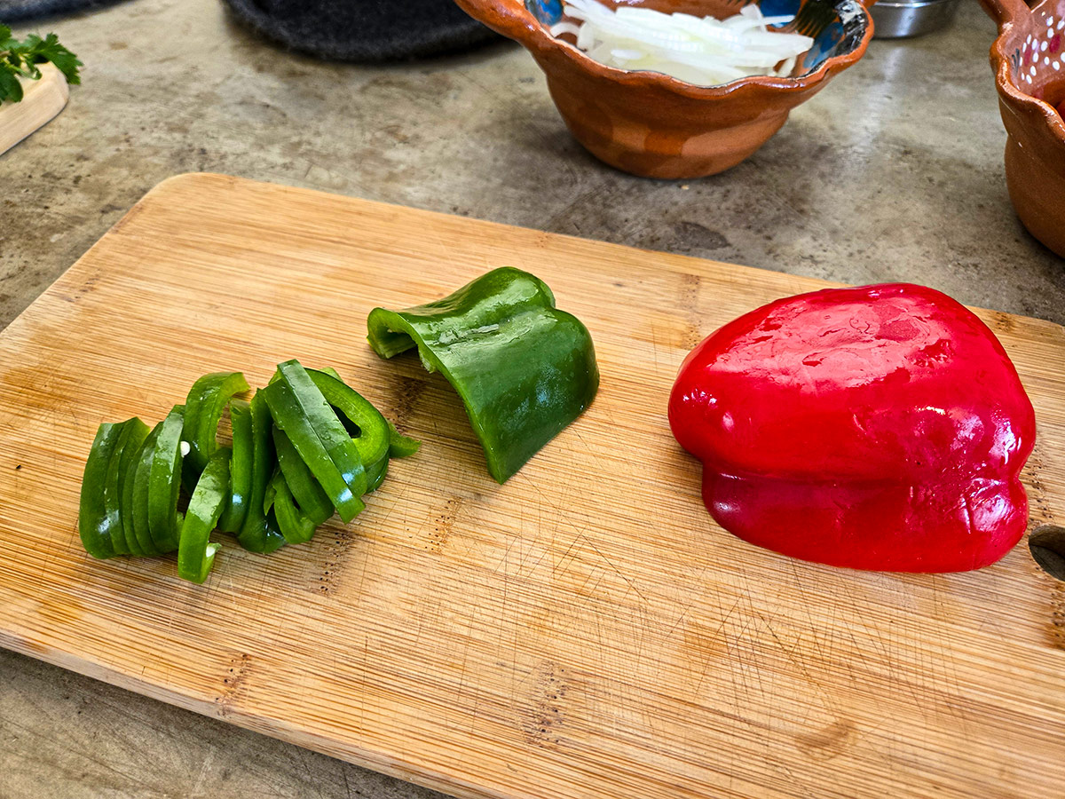 🔹 Dela röd och grön paprika i fyra delar på längden, ta bort kärnhus och skär varje del i ca 5 mm breda skivor (kvartsmånar).