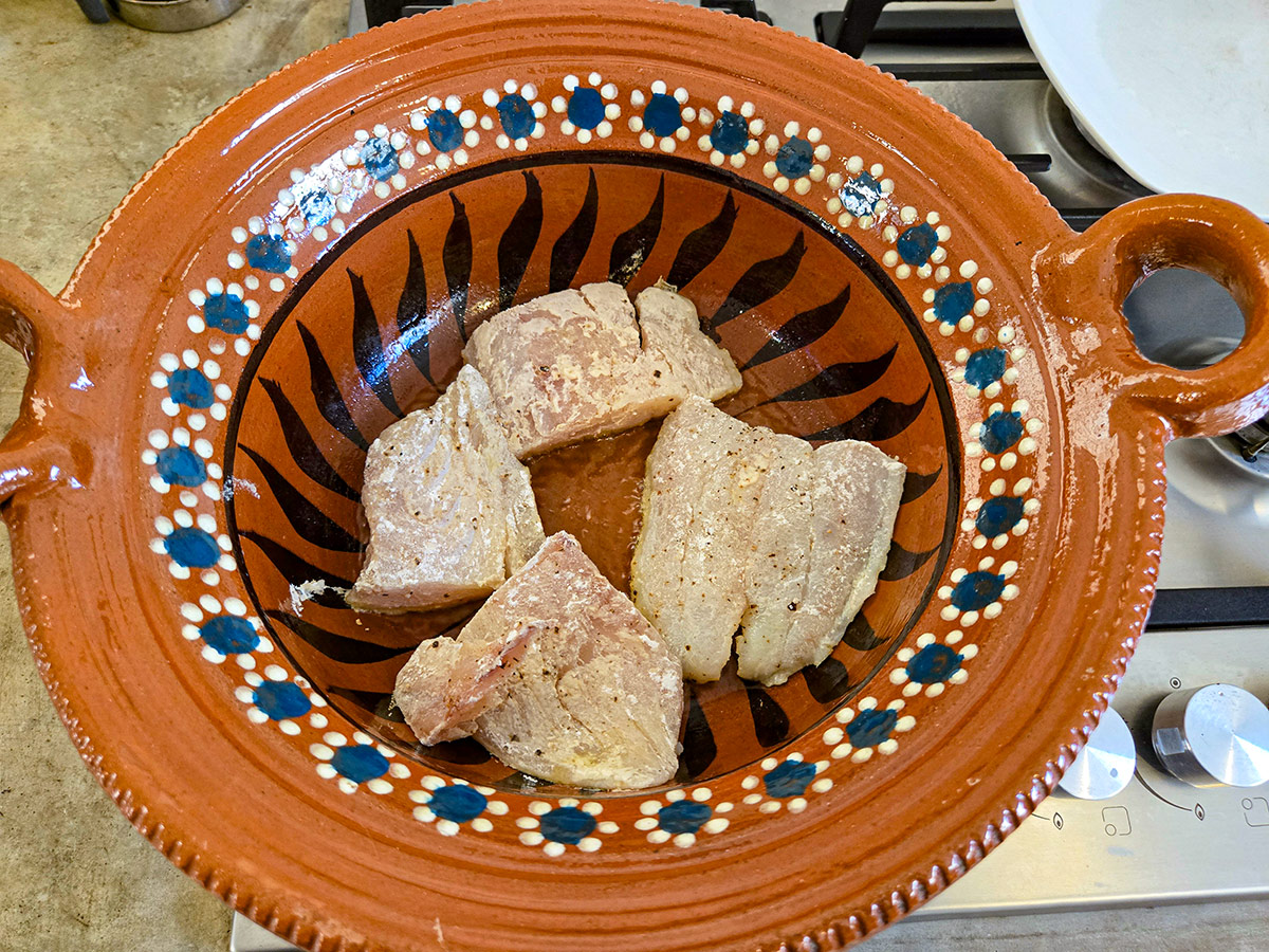 Om du använder ben- och skinnfria bitar av fiskfilé är det en god idé (men inte nödvändig) att mjöla och lätt försteka fisken innan den hamnar i grytan, det gör att den lättare håller ihop då du enbart snabbt behöver värma upp den i grytan igen. Använder du hel fisk eller fisk med skinnet på kan du hoppa över detta steg!