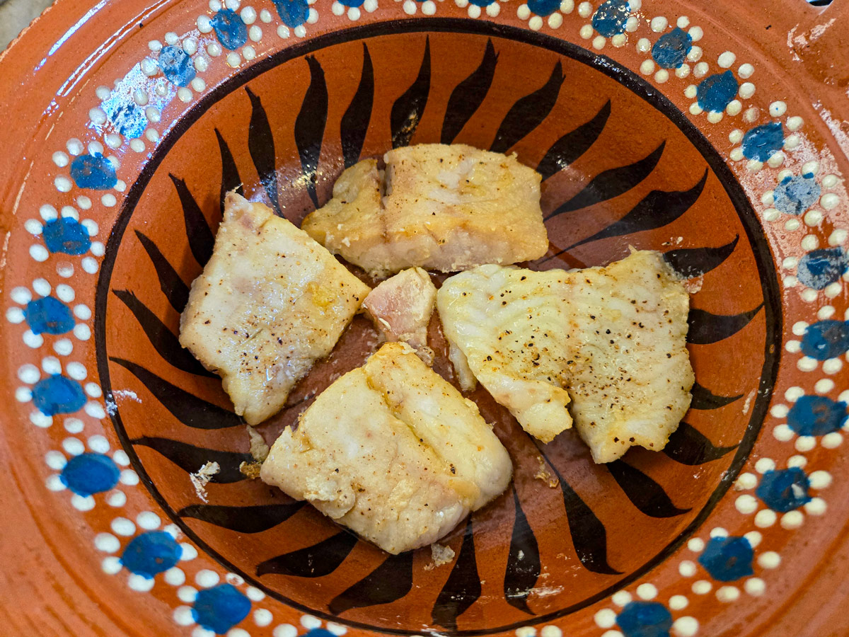 🔹 Kontrollera att fisken är genomlagad — den ska vara mjölkvit och lätt falla isär med gaffel.