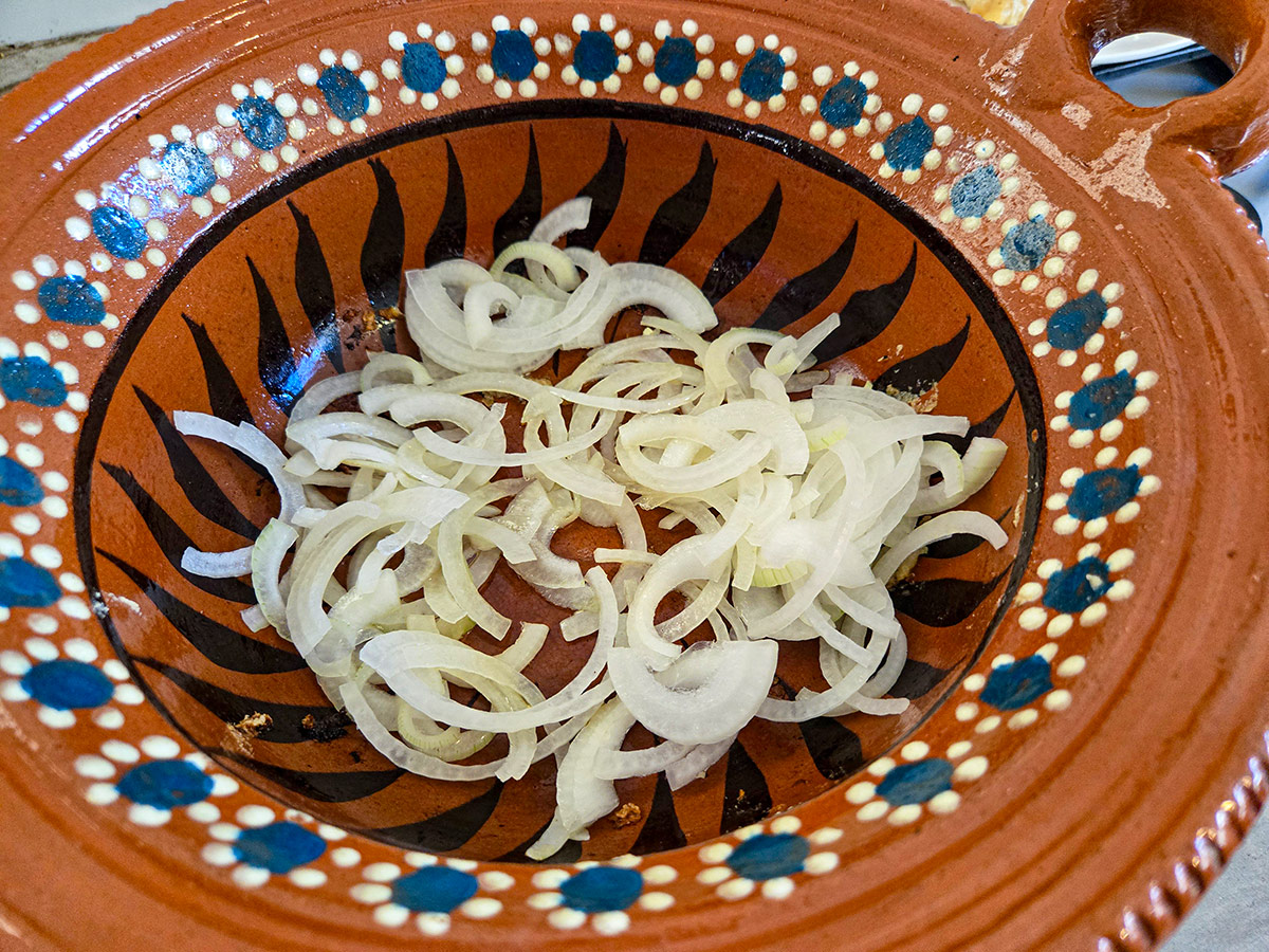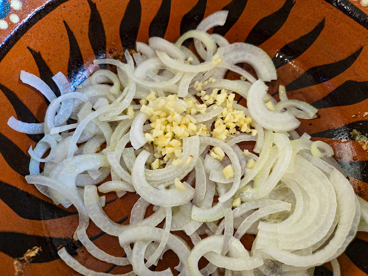 🔹 Skiva gul lök i halvmånar, ca 2–3 mm tjocka.