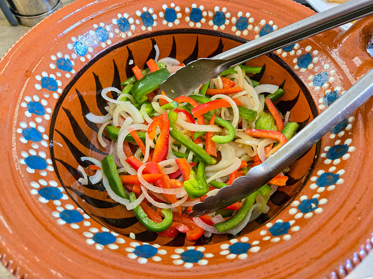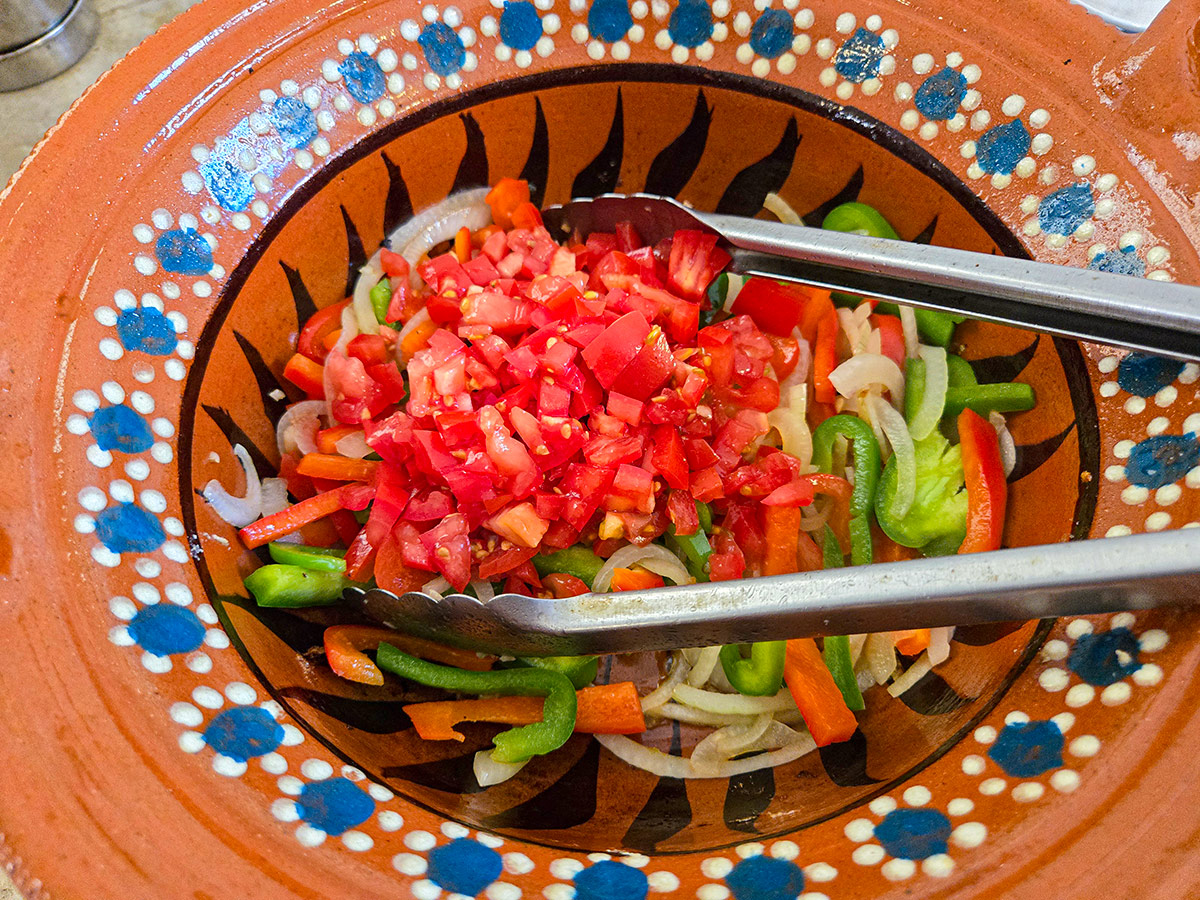 Traditionellt används Chile güero, en mild ljusgul inlagd chili som ger både färg och subtil hetta. I Sverige är den svår att hitta, men du kan med gott resultat använda: