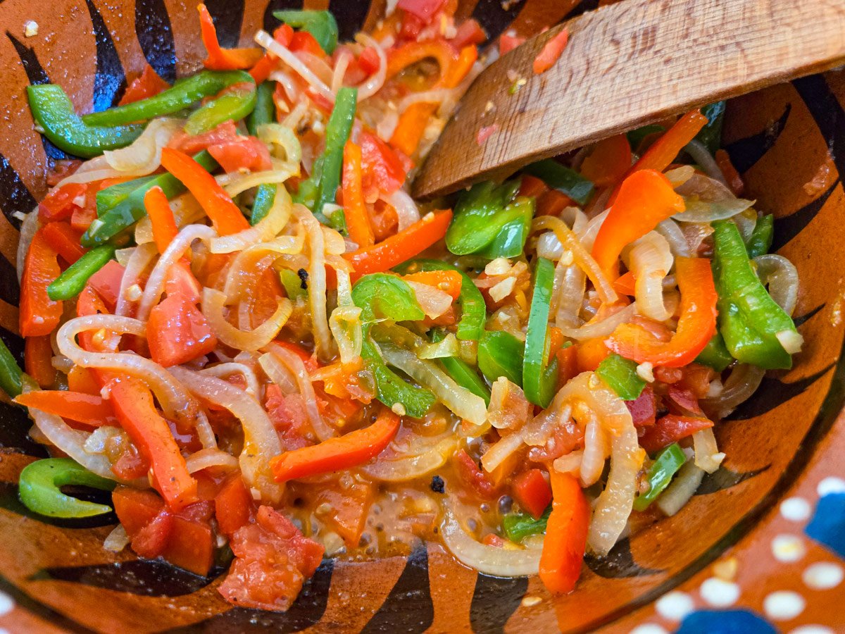 Paprikans korta stekning bevarar färg och struktur, vilket ger såsen visuell livlighet och textur.