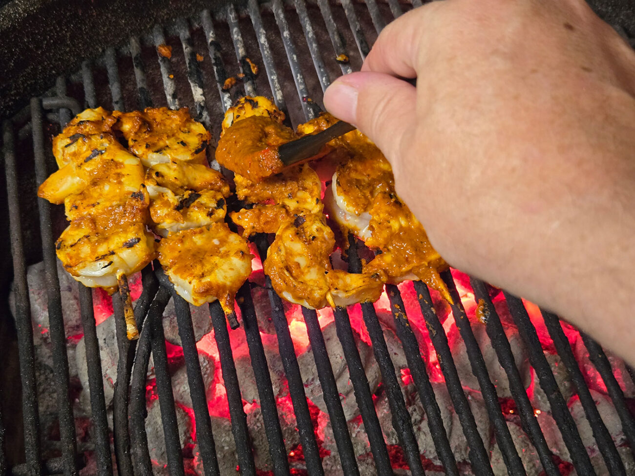 För att få extra kryddighet, pensla på ett extra lager glaze precis innan räkorna är färdiga. Det ger mer hetta och djup i smaken.