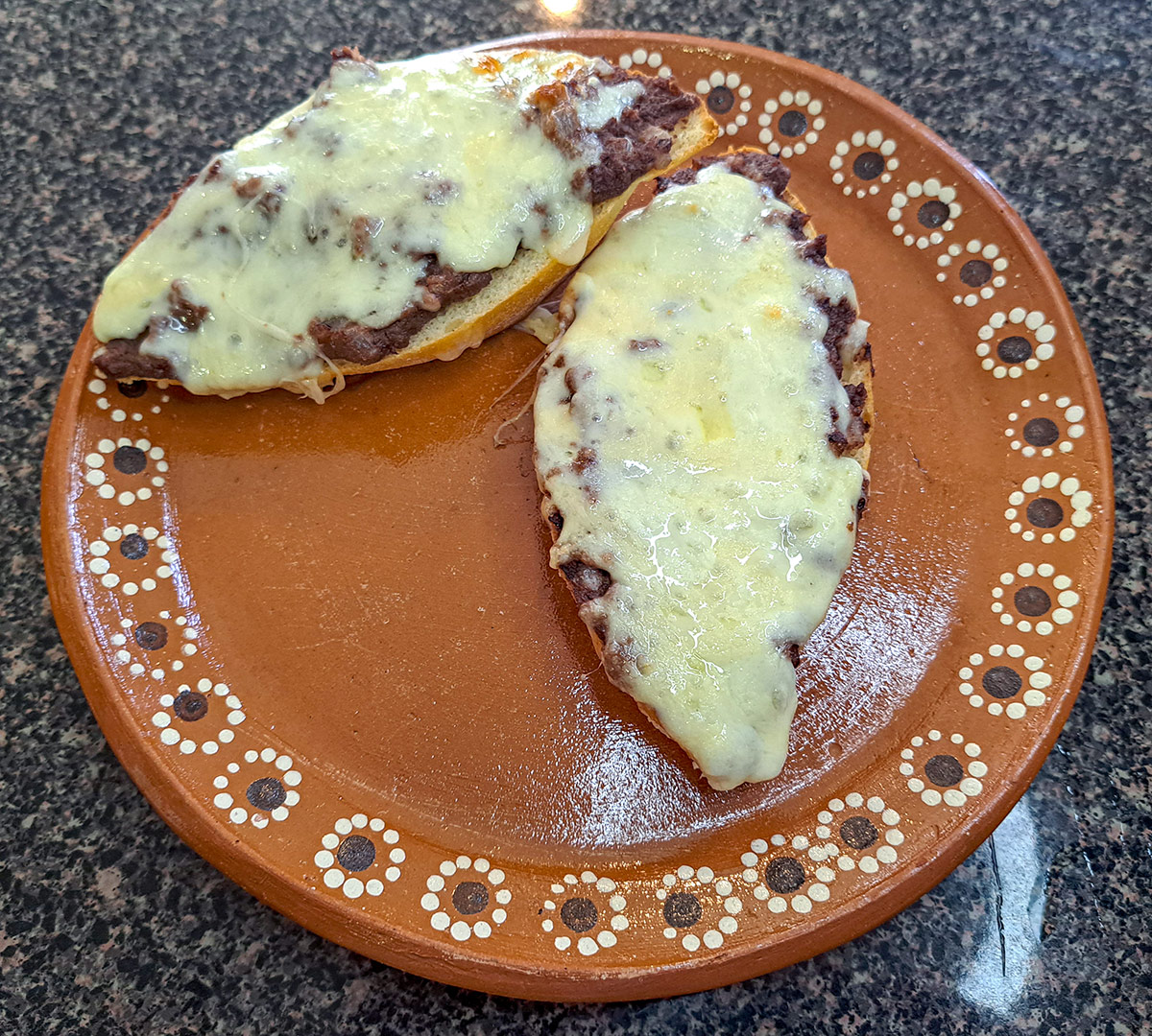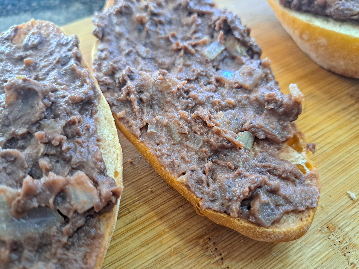 Brödet på en Mollete toppas med ett litet lager av refried beans. Även om refried beans på pintobönor kanske är vanligast föredrar vi refried beans gjorda på svarta bönor även om smaken nästan är identisk på slutresultatet. Du kan göra refried beans på nästan alla typer av bönor men får du inte tag på svarta- eller pintobönor är kanske kidneybönor att föredra.