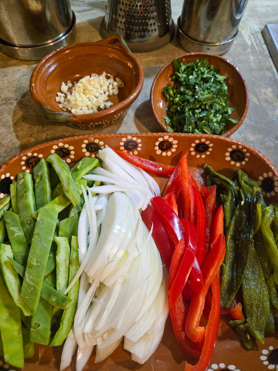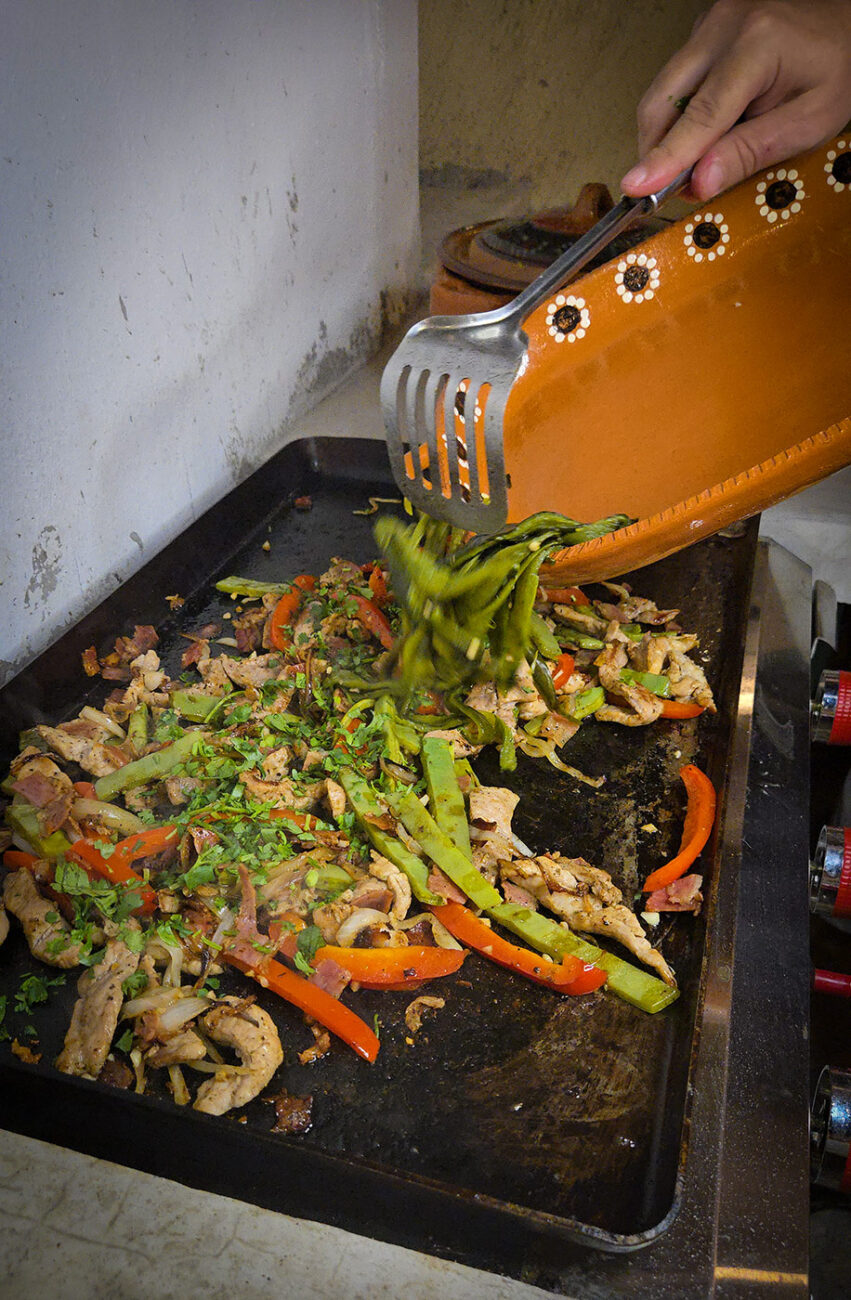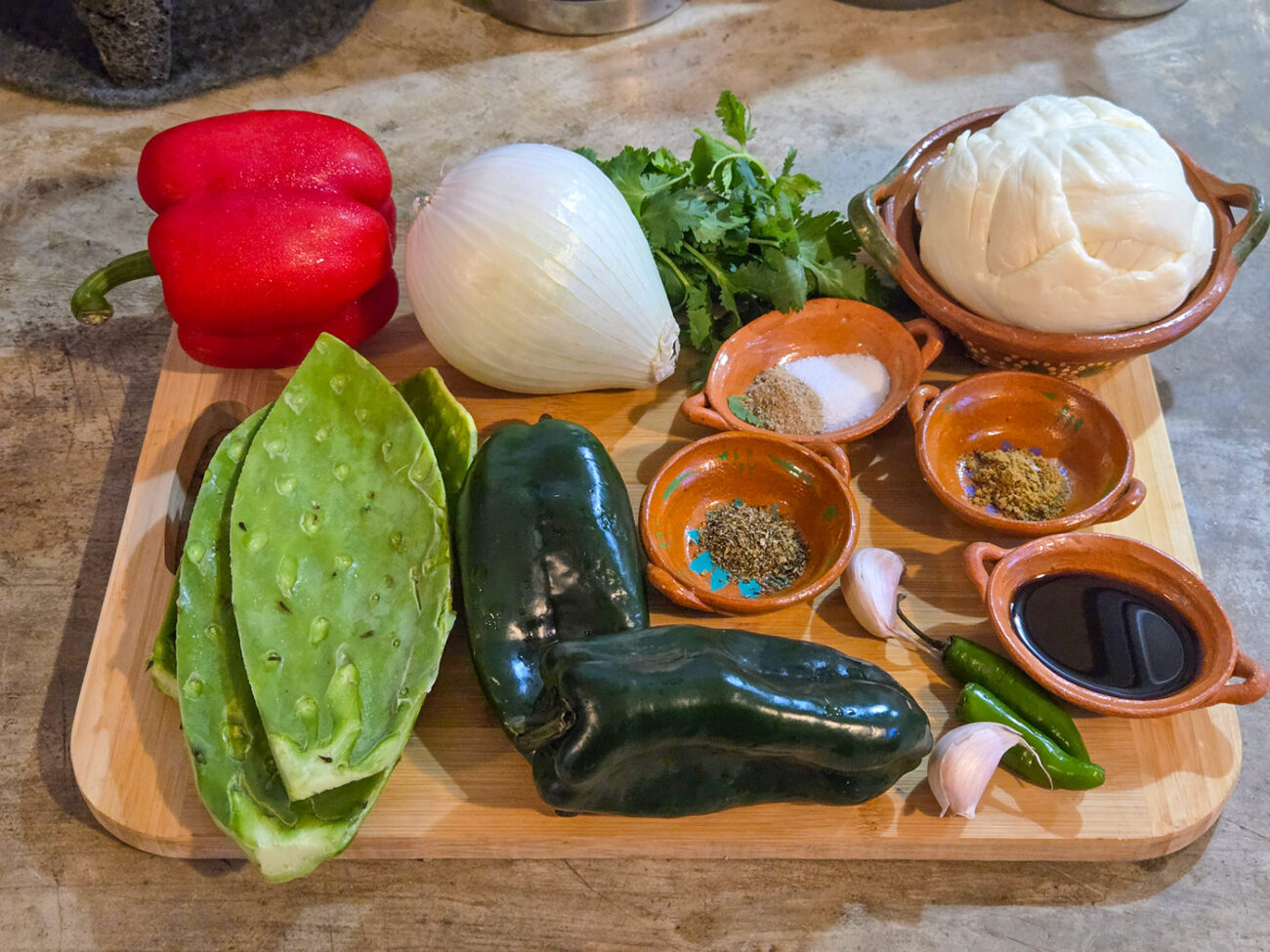 Nopalkaktusen är en grön, krispig grönsak med en lätt syrlig smak. I mexikanska livsmedelsaffärer säljs den färsk, med taggar avskrapade direkt i butiken. Vi har skrivit mer om nopales här! Saknar du tillgång till färsk nopales fungerar zucchini utmärkt som ersättning — samma crunch, något annorlunda smak. Du kan även hitta strimlad konserverad kaktus i svenska nätbutiker; lägg i den mot slutet av tillagningstiden eftersom den redan är tillagad.