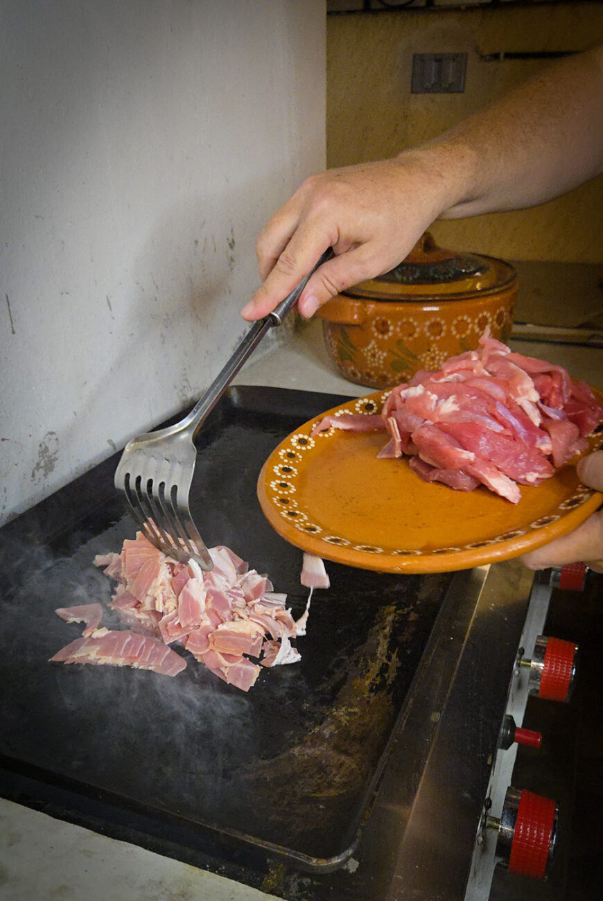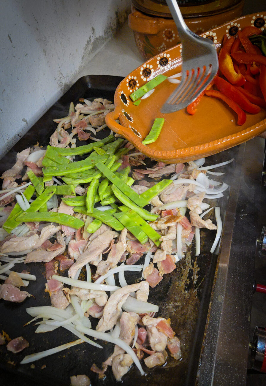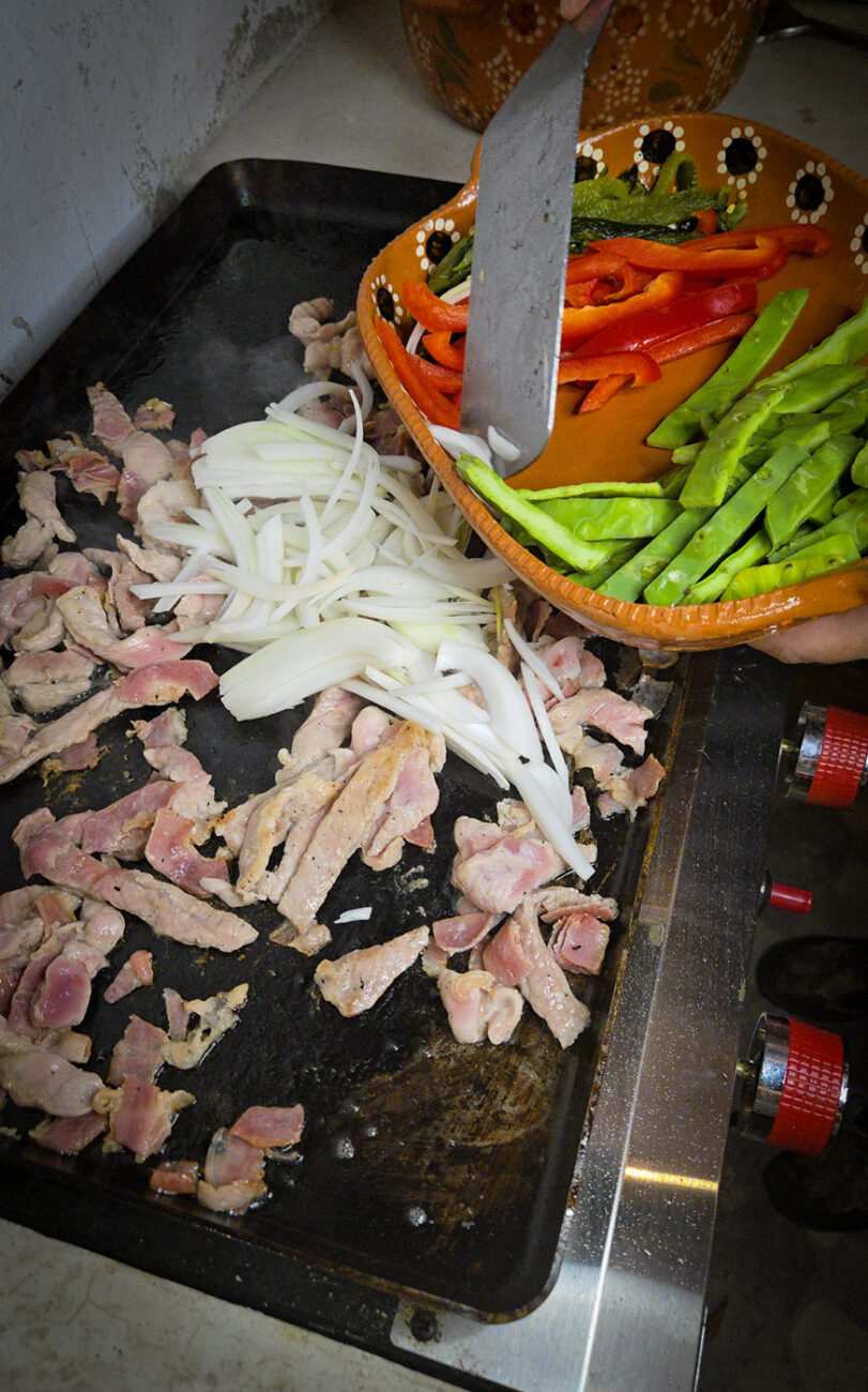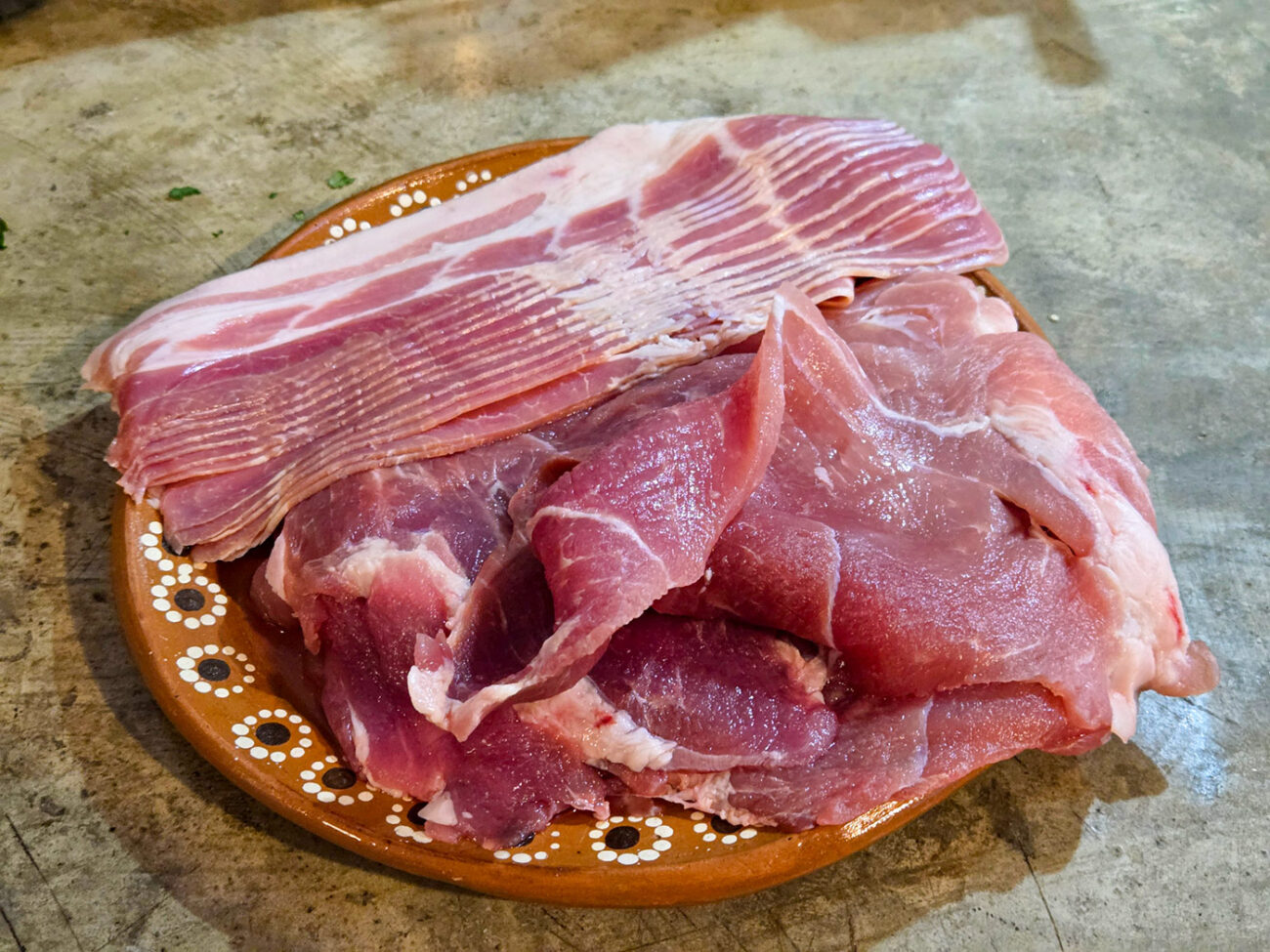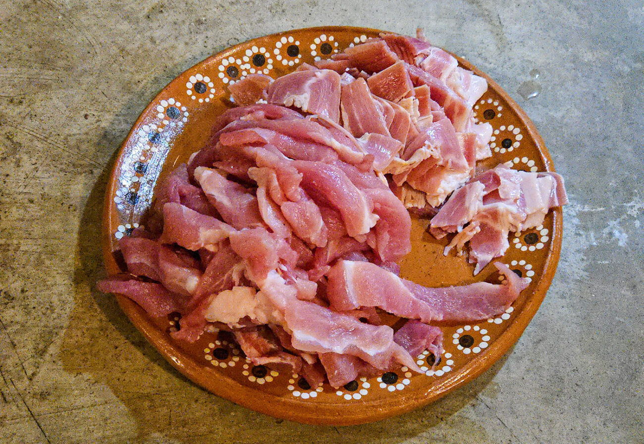 Det här är en alambre på fläskkött. Vi använder en kombination av bacon och fläsk — vanligtvis fläskkotlett, men opanerad fläskschnitzel skuren i remsor fungerar minst lika bra. Fläskytterfilé eller fläskfilé är andra bra alternativ. Det viktigaste är att köttet är skuret i tunna remsor så det tillagas snabbt.