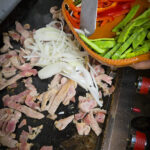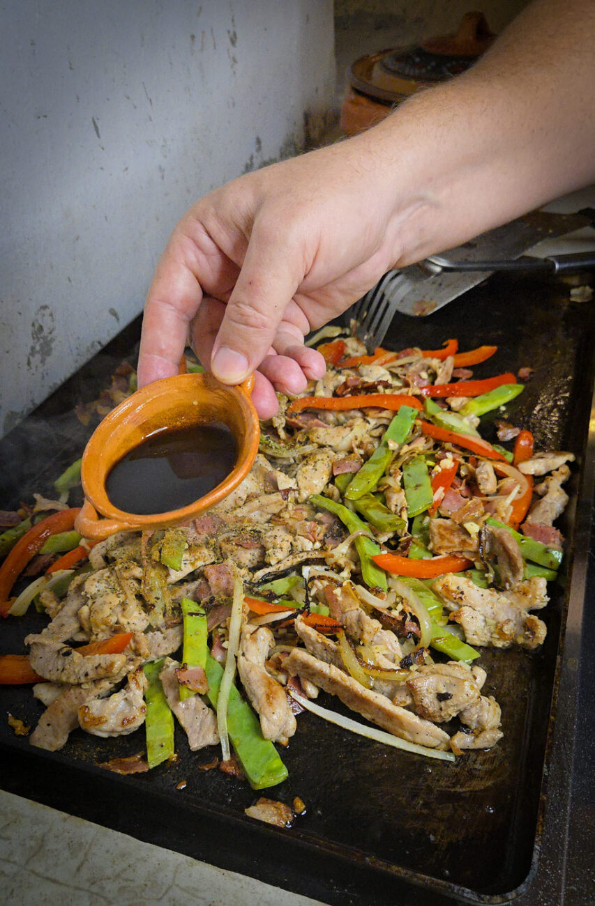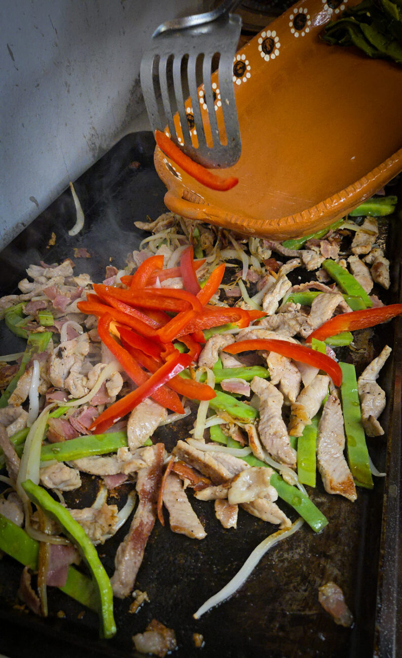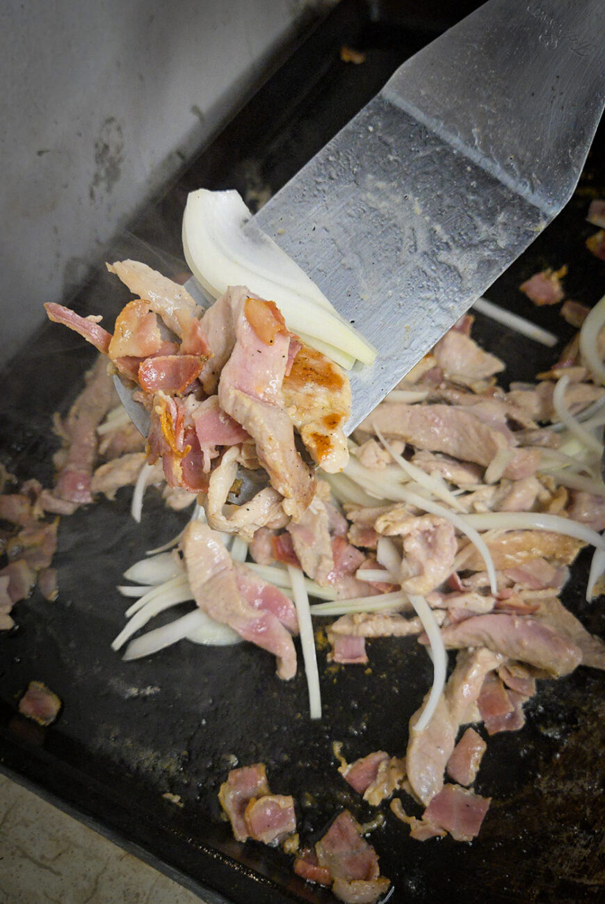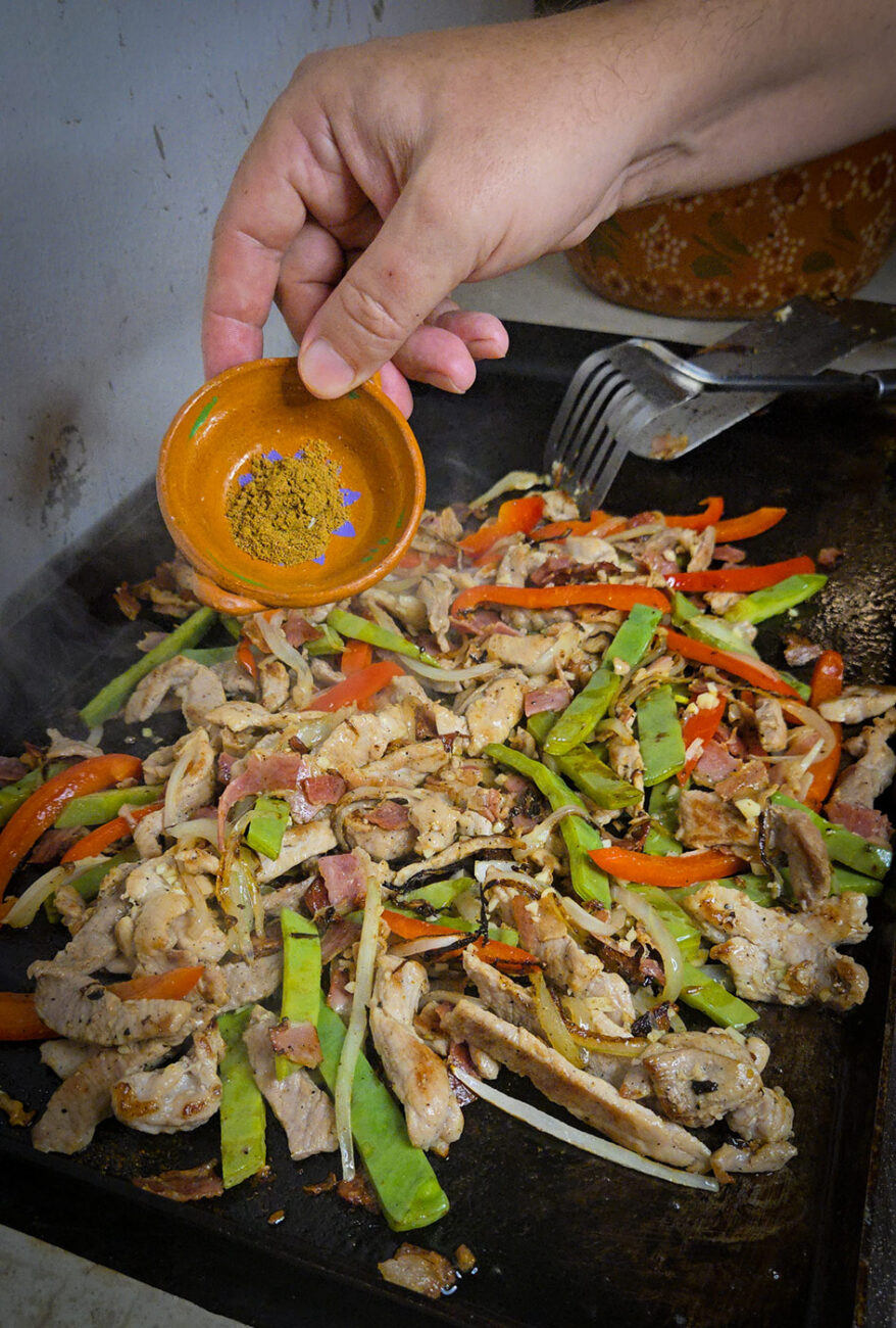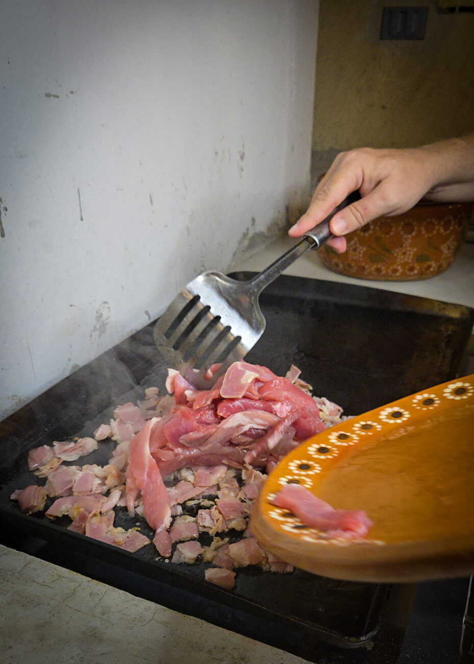 Det här är en alambre på fläskkött. Vi använder en kombination av bacon och fläsk — vanligtvis fläskkotlett, men opanerad fläskschnitzel skuren i remsor fungerar minst lika bra. Fläskytterfilé eller fläskfilé är andra bra alternativ. Det viktigaste är att köttet är skuret i tunna remsor så det tillagas snabbt.