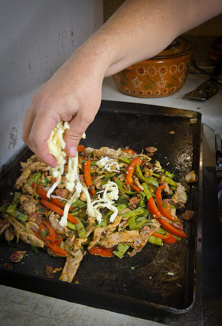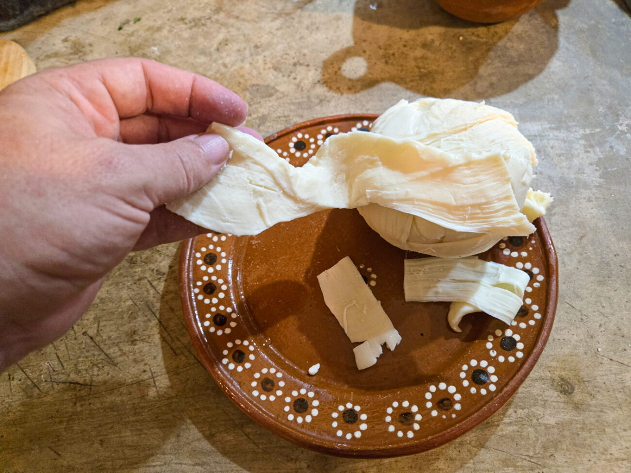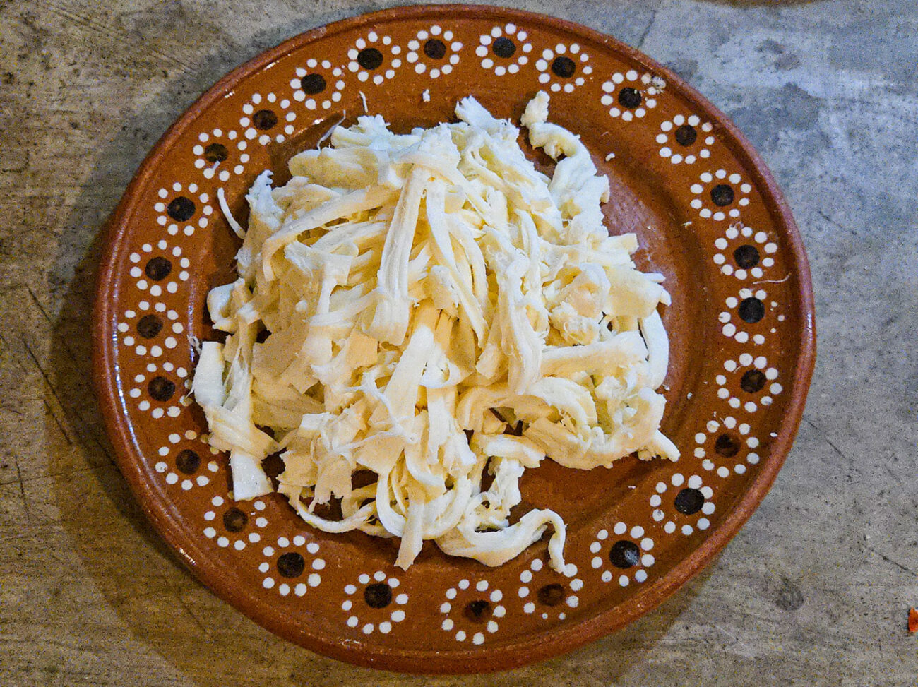 I Mexiko används ofta en lättsmält ost från delstaten Oaxaca — liknande mozzarella i smak men något torrare och går att dra i remsor. Riven mozzarella eller annan mild, smältbar ost fungerar utmärkt. Undvik lagrade ostar som tar över smaken.
