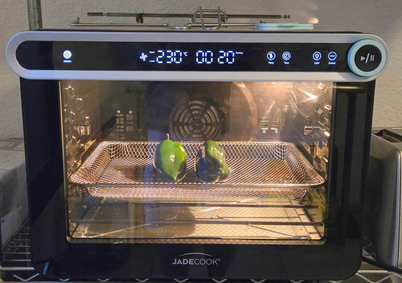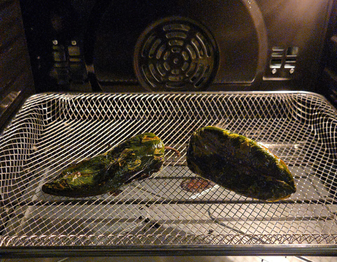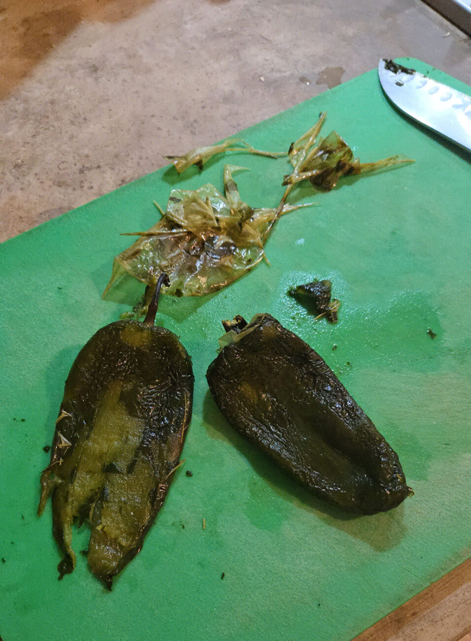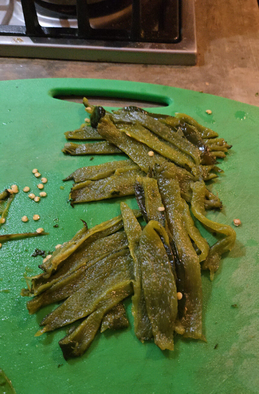 Poblano är en stor, mild grön chili som används för sin smak snarare än sin hetta. Den finns på burk, ibland fryst och under säsong även färsk. Saknas den helt, byt ut mot grön paprika och tillaga den på samma sätt: bränn skinnet svart över öppen låga, i airfryer eller under grillelementet i ugnen tills det släpper. Det ger en rökig sötma som passar perfekt i alambren.