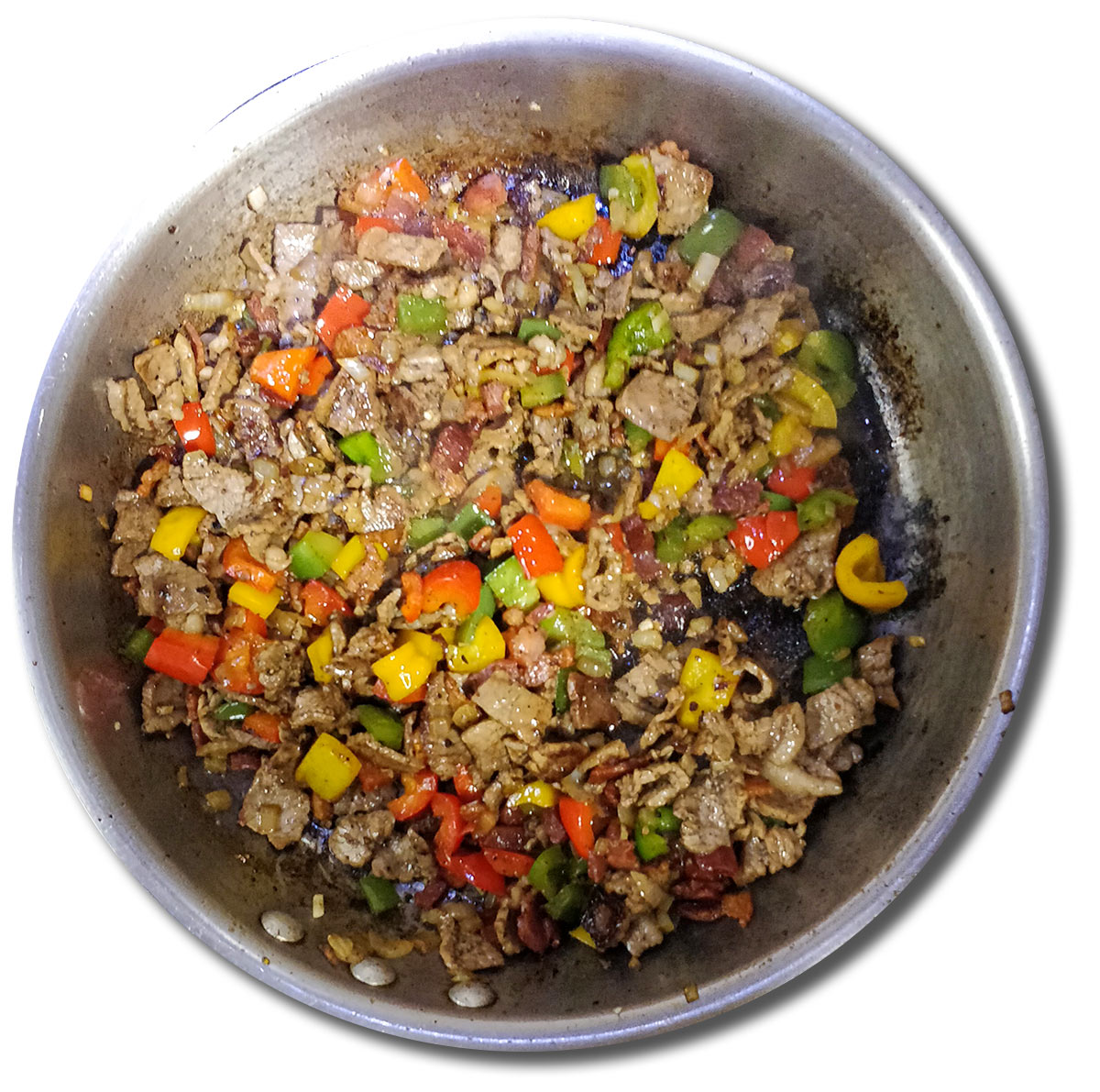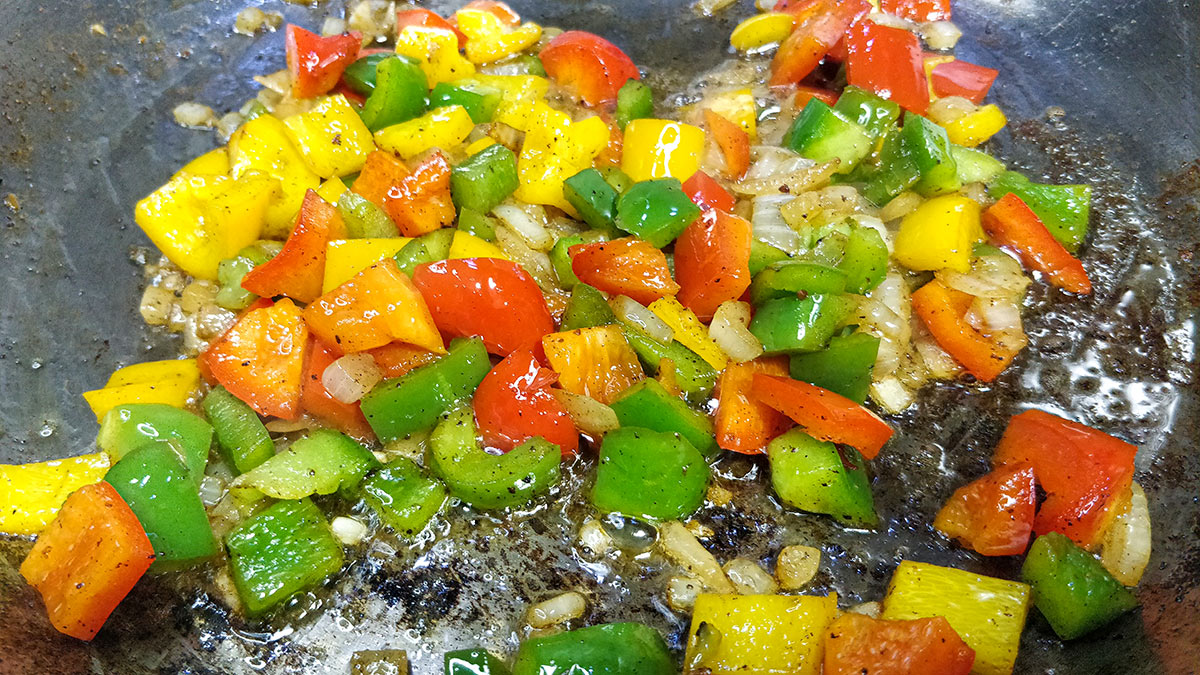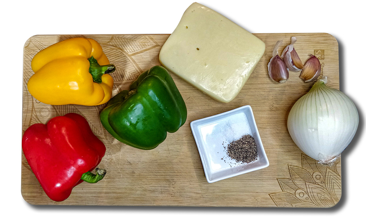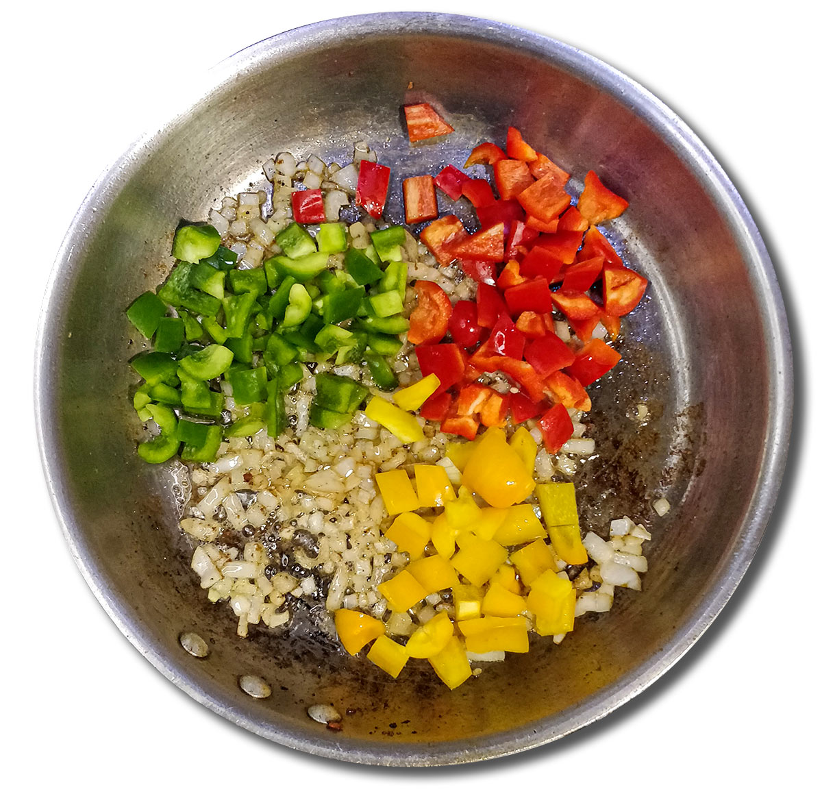 Vi använder tre olika färger på paprikan i receptet nedan, men du kan använda dina favoriter. Du kan använda mängden paprika du gillar, våra var mellanstora så en halv paprika av vardera färg blev utmärkt.