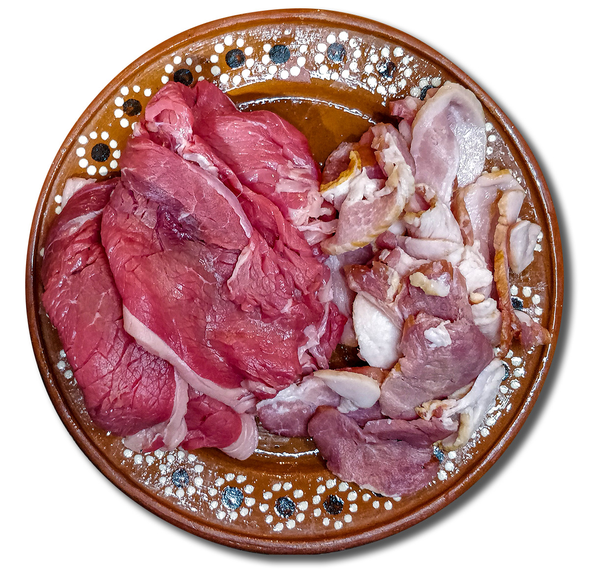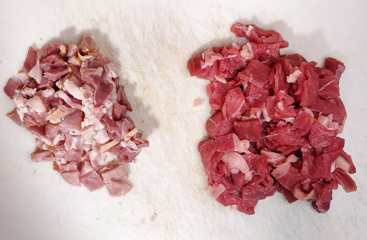 Skär köttet och baconskivorna i ca centimeterstora fyrkanter.